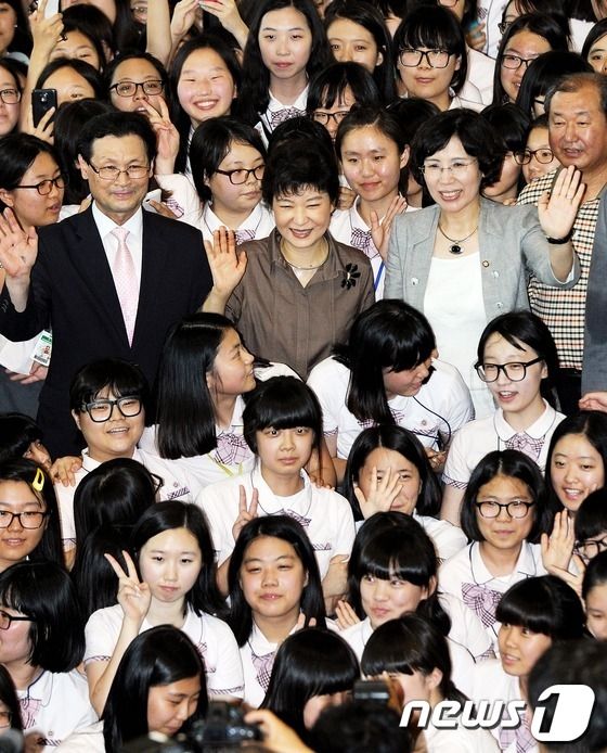 ソウル市城北区の長位中学校で7日午前、第27回卒業式が行われ、卒業生たちが教師と記念撮影をしている。